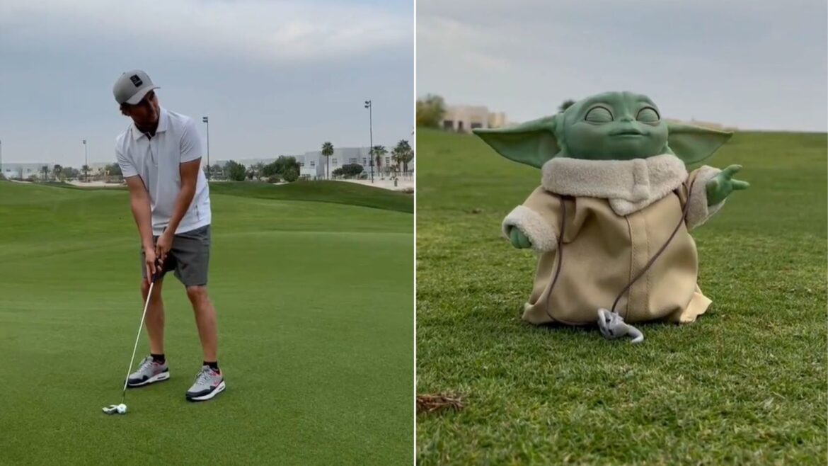 Checo Pérez impacta con su habilidad para el golf junto a Baby Yoda