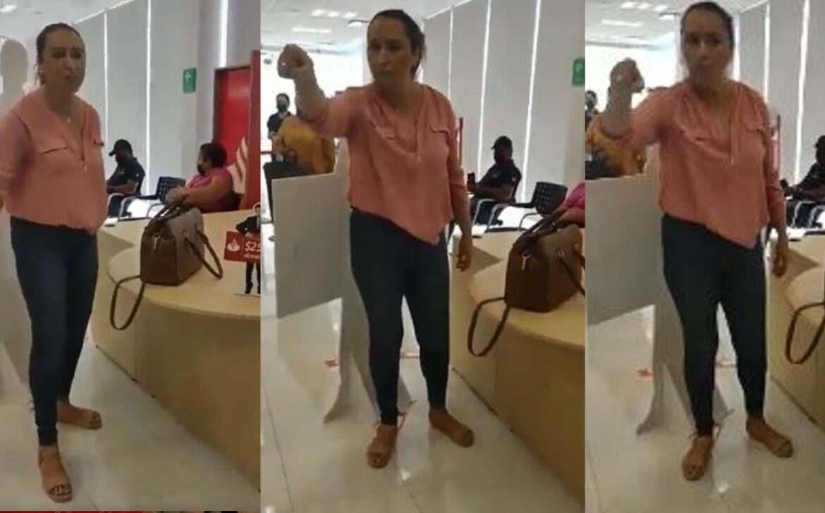 El personal del banco le pide en reiteradas ocasiones que se tranquilice, mientras ella sigue lanzando insultos e incluso se puede escuchar que arroja objetos al suelo.