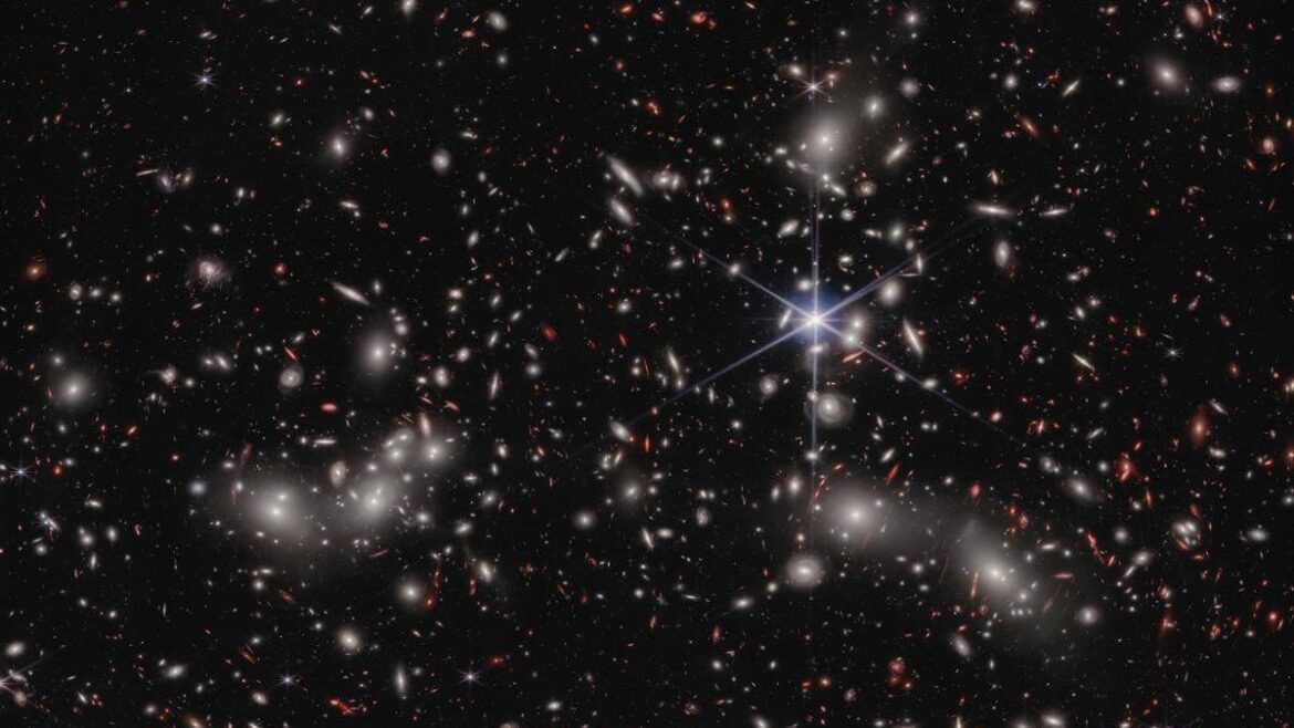 El telescopio espacial James Webb ha desvelado detalles nunca antes vistos de una región del espacio conocida como Cúmulo de Pandora; la imagen muestra tres cúmulos de galaxias, ya de por sí masivos, que se unen para formar un megacúmulo. La masa combinada de los cúmulos de galaxias crea una poderosa lente gravitacional, un efecto de aumento natural de la gravedad, que permite observar galaxias mucho más distantes en el universo primitivo usando el cúmulo como una lupa.