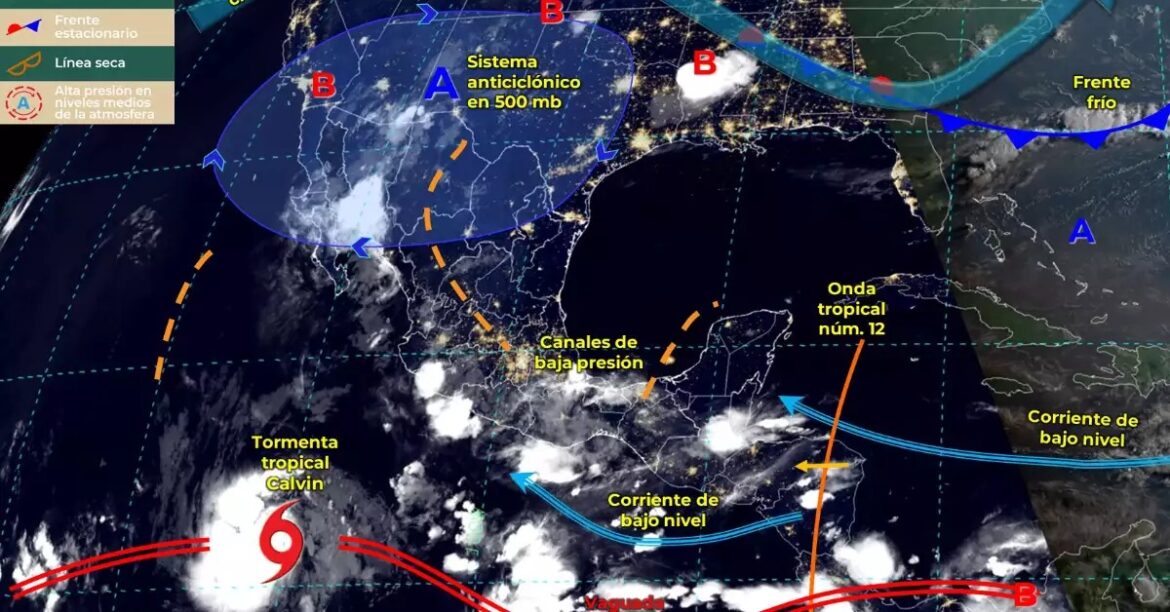 El Servicio Meteorológico Nacional (SMN) informó que la depresión tropical ‘Tres-E’ se intensificó a la tormenta tropical Calvin en el Océano Pacífico.El ciclón no afecta al país y se aleja poco a poco del territorio nacional. Está a 1.170 kilómetros al sur de las costas de Baja California Sur.La tormenta tiene vientos máximos sostenidos de 75 km/h y rachas de 95 km/h. En esa zona se prevé que ocasione lluvias, viento y oleaje elevado.La recomendación es tomar las precauciones necesarias en la navegación marítima y para la población, atender las recomendaciones emitidas por las autoridades de Protección Civil.